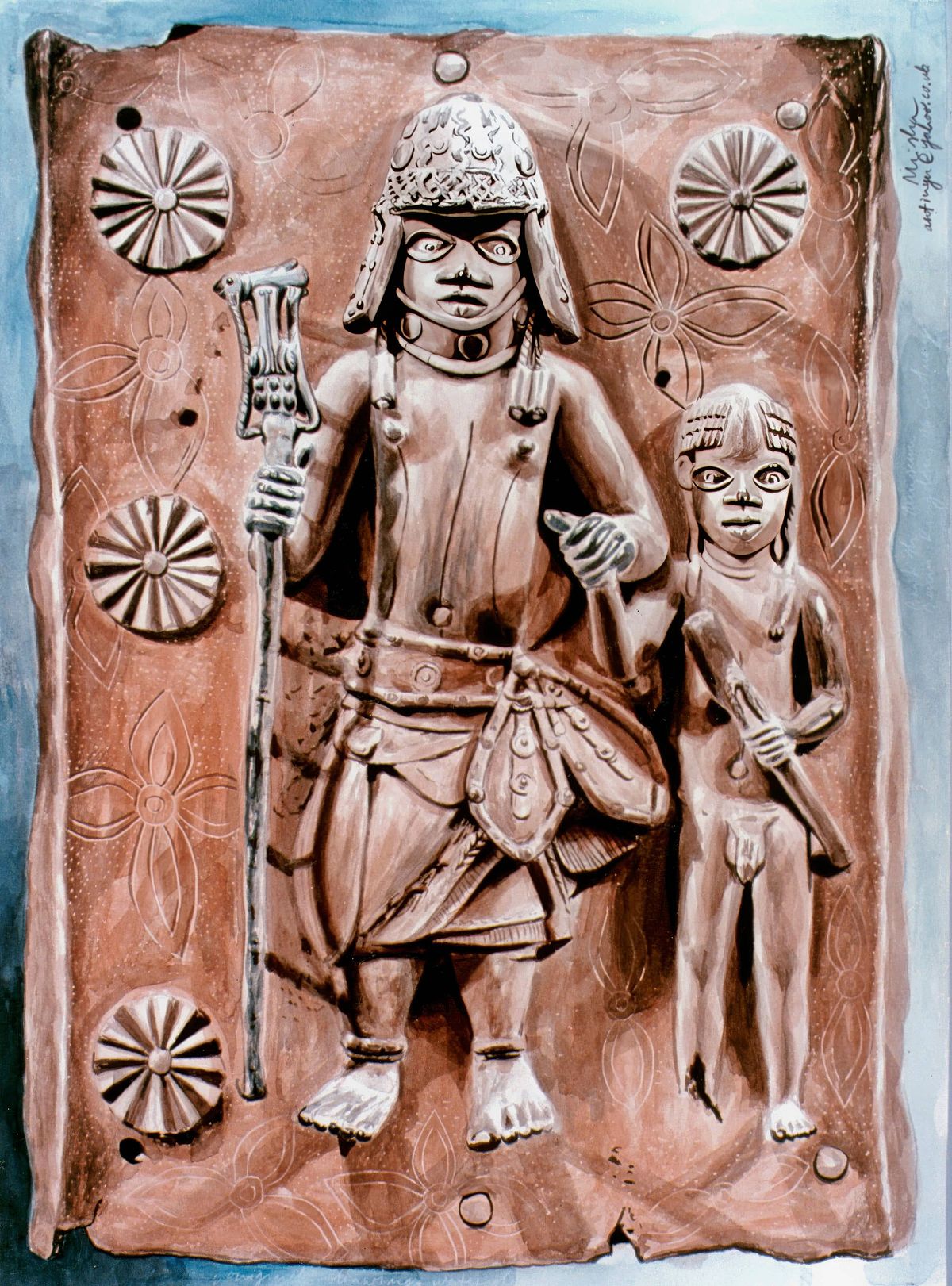 In this watercolor painting, I used a palette of sepia and earth tones to intricately replicate the deep texture and aged patina of a historical Benin bronze plaque. The central focus is a detailed figure of a warrior-king, with his traditional feathered headdress and sword, surrounded by stylized floral rosettes. My primary goal was to use watercolor to build a persuasive illusion of corroded metal, giving the flat paper a profound, sculptural relief-like quality. The artwork is presented in a natural light and includes my own handwritten notations and signature directly on the paper beneath the central image.